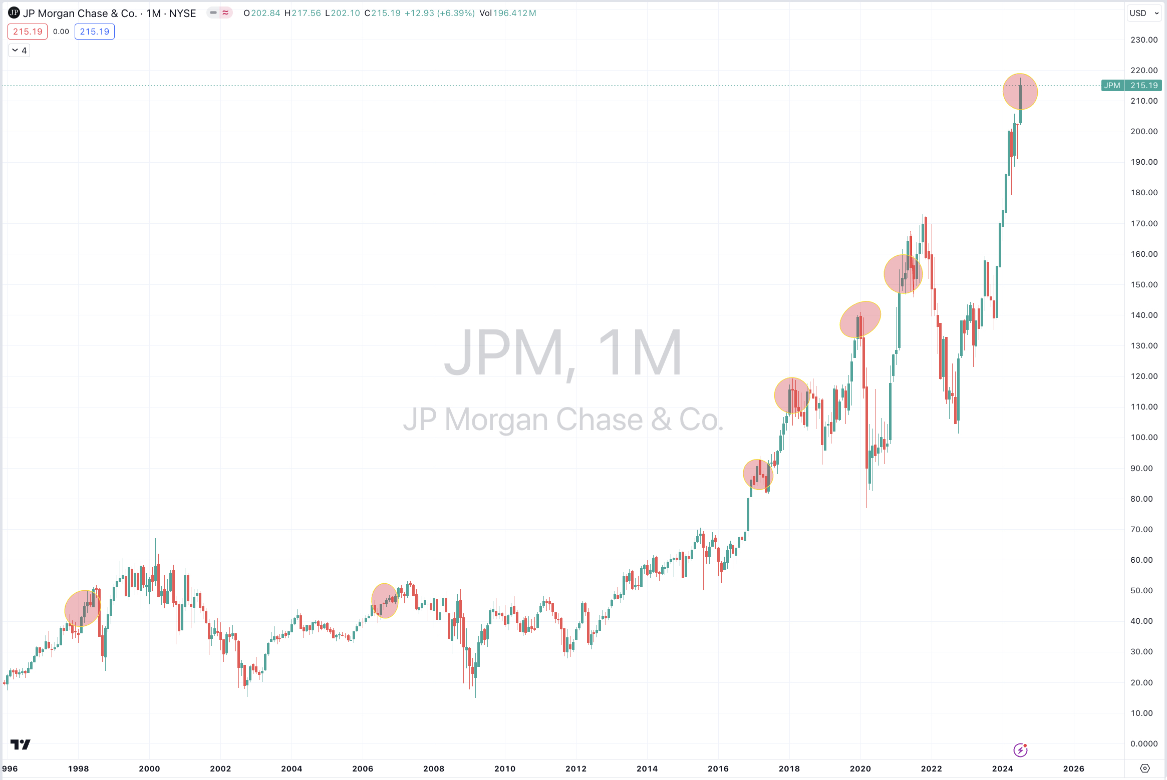 The JP Morgan share price is currently trading at a level which portends to it experiencing something between multi-years of sideways travel or resembling a share price decline close to 23%.