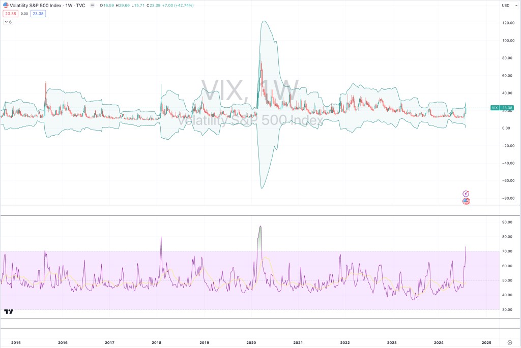 It is the 4th time in 10 years that the VIX Index has simultaneously registered a weekly overbought signal and traded to 5 standard deviations above its 20 week moving average.