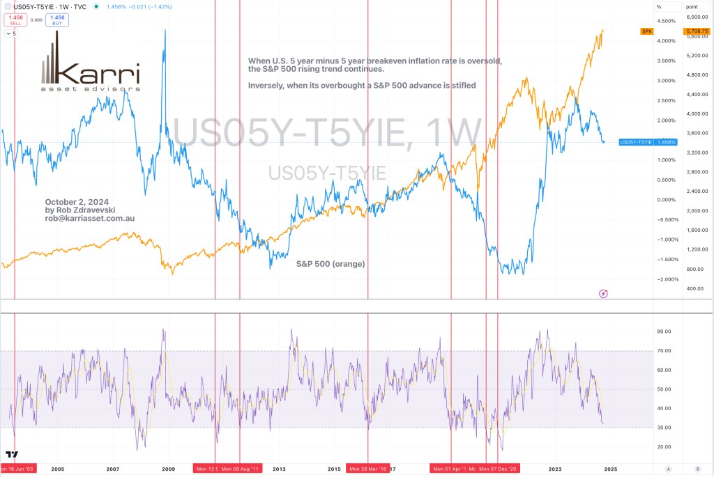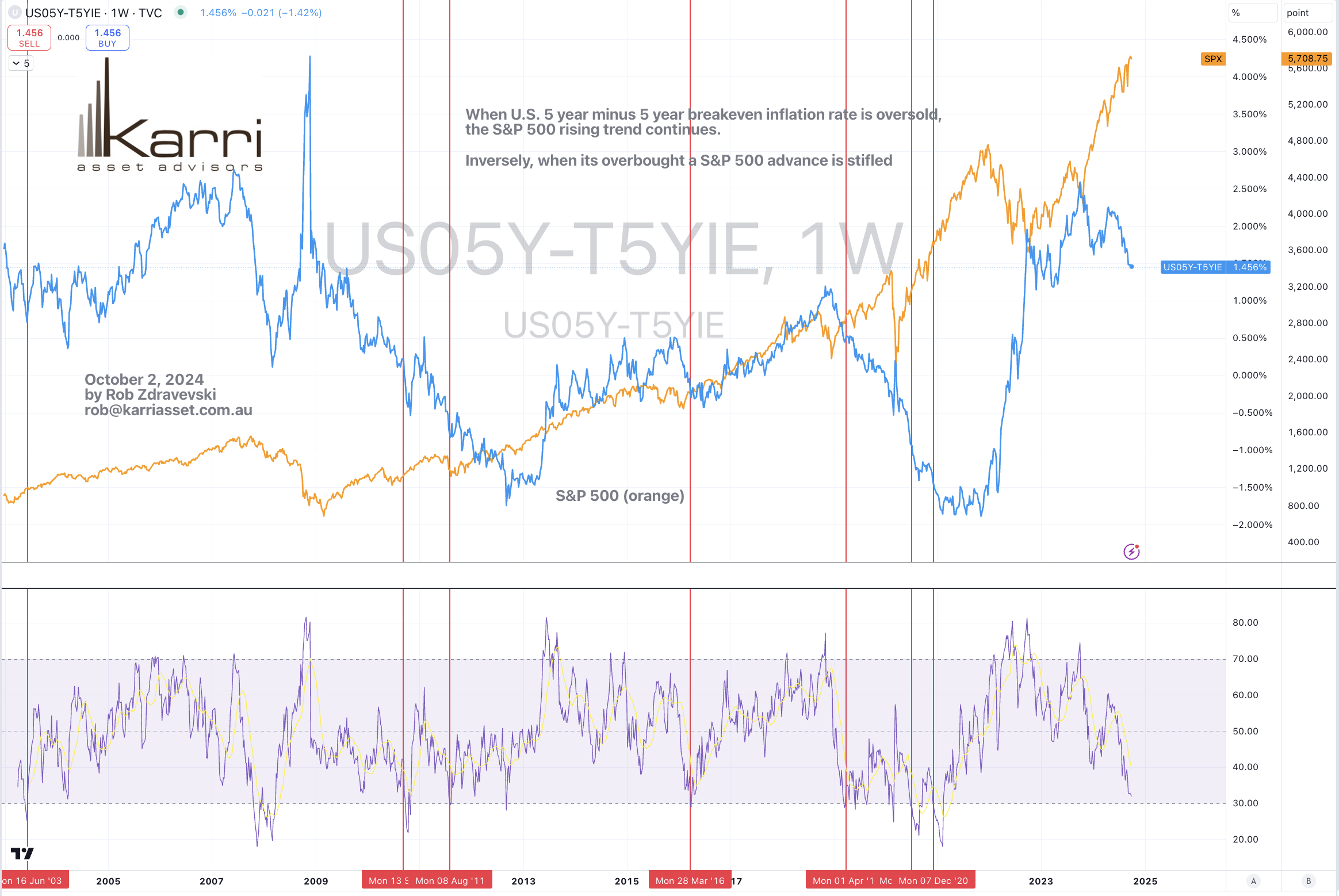 Watching when the spread in the study below trades at extremes can assist validating the continuation or waning of a trend in the S&P 500.