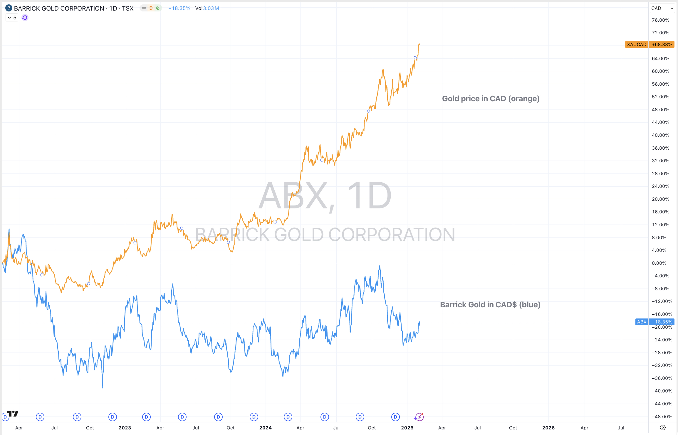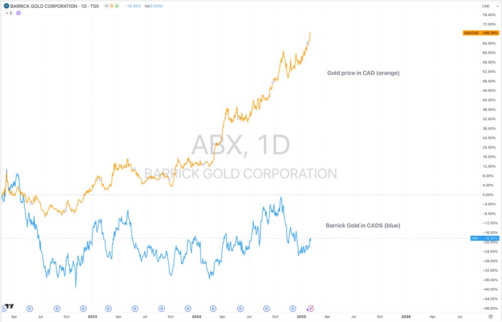 In the study below, Barrick Gold’s stock price has fallen 18% while Gold (as priced in CAD) has risen 68%.