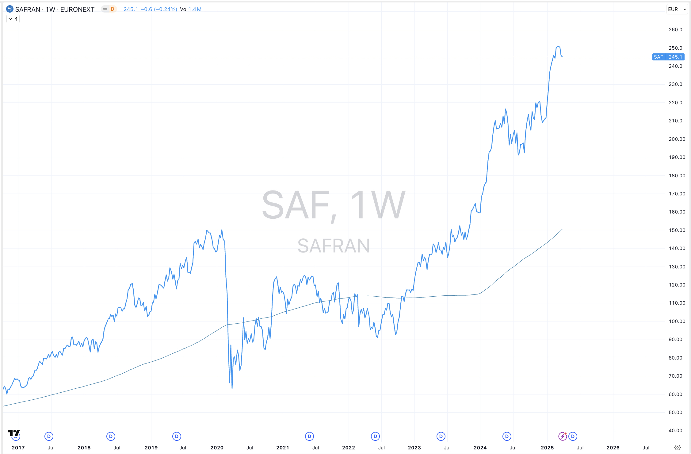 Out of curiosity, how do you get to the 170€ area on Safran? I get roughly to the same area with Elliott Waves on the weekly chart