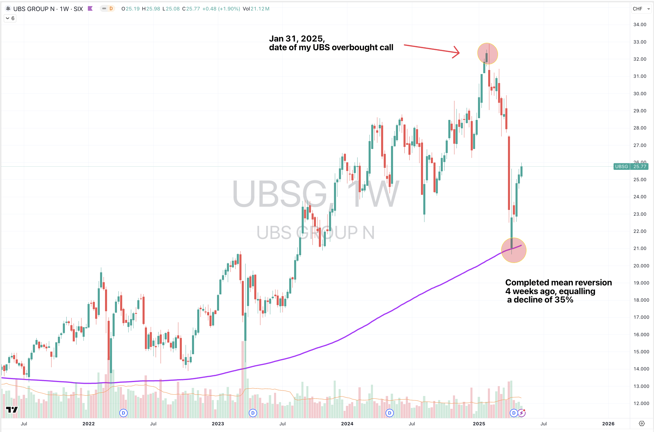 On January 31st, 2025, I called UBS stock price as being overbought and trading at notable extremes.
