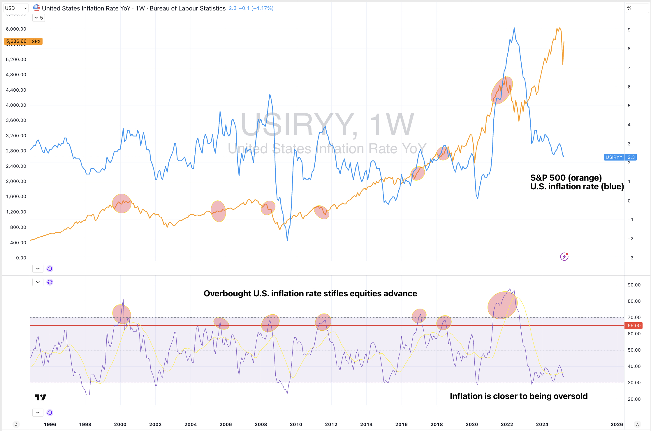 When U.S. inflation is ‘overbought’, it stifles the advance in equities.