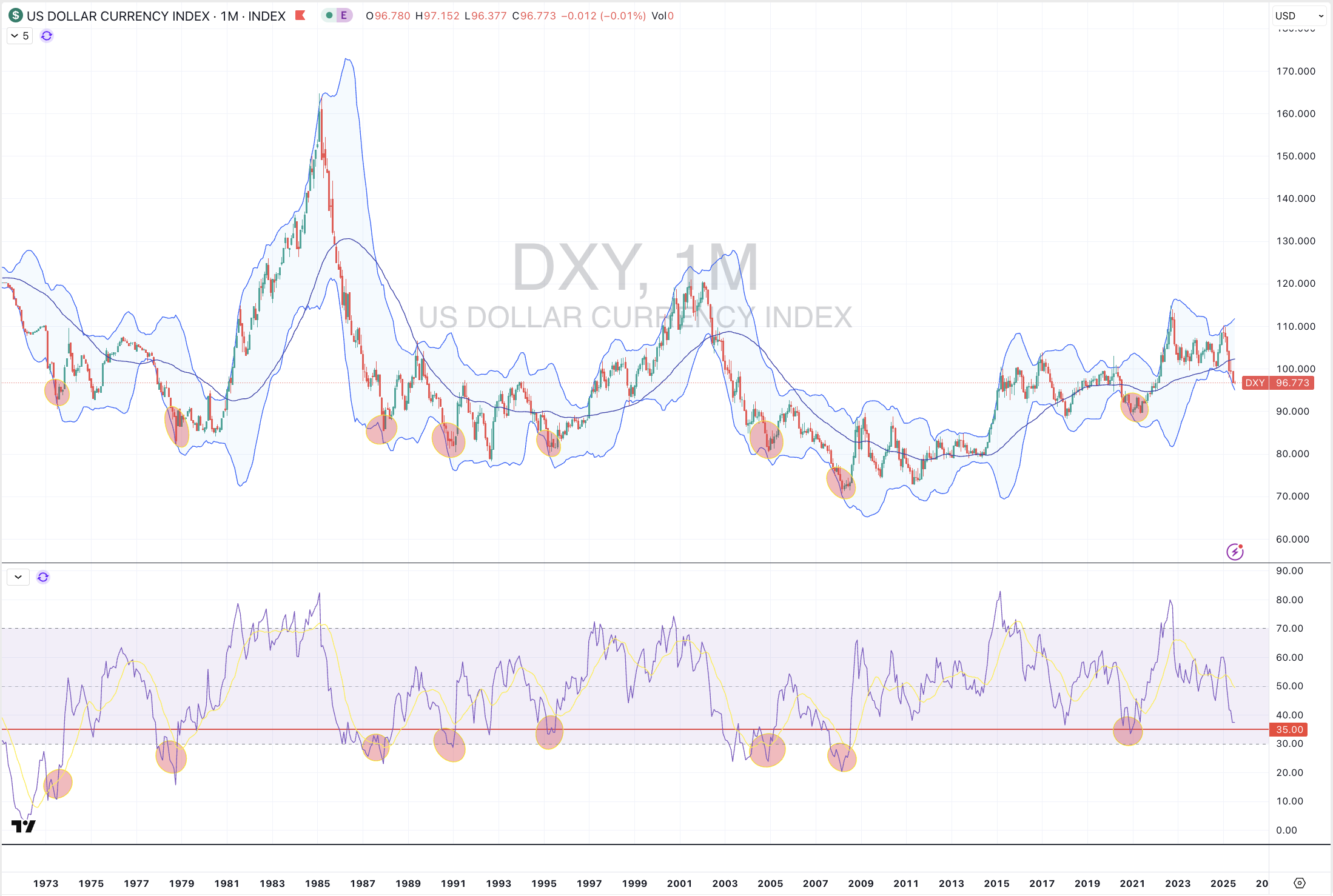 The attached study shows 8 moments over the past 50 years when the U.S. Dollar (DXY) Index has registered certain metrics which has an impact on commodity prices and bond yields.