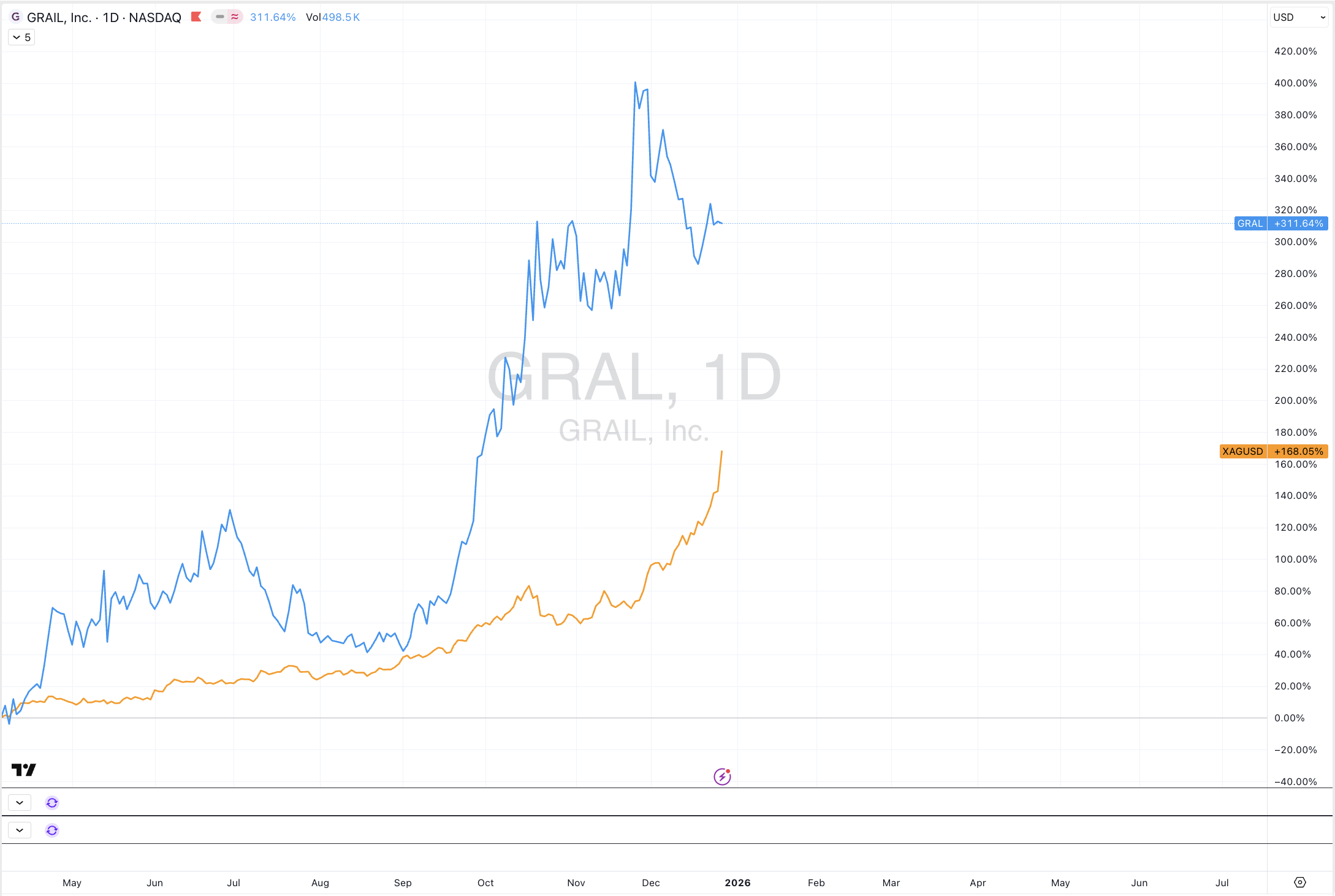 Over the past 6 months, the share price of U.S. healthcare company, Grail Inc. have considerably outperformed the price of Silver.