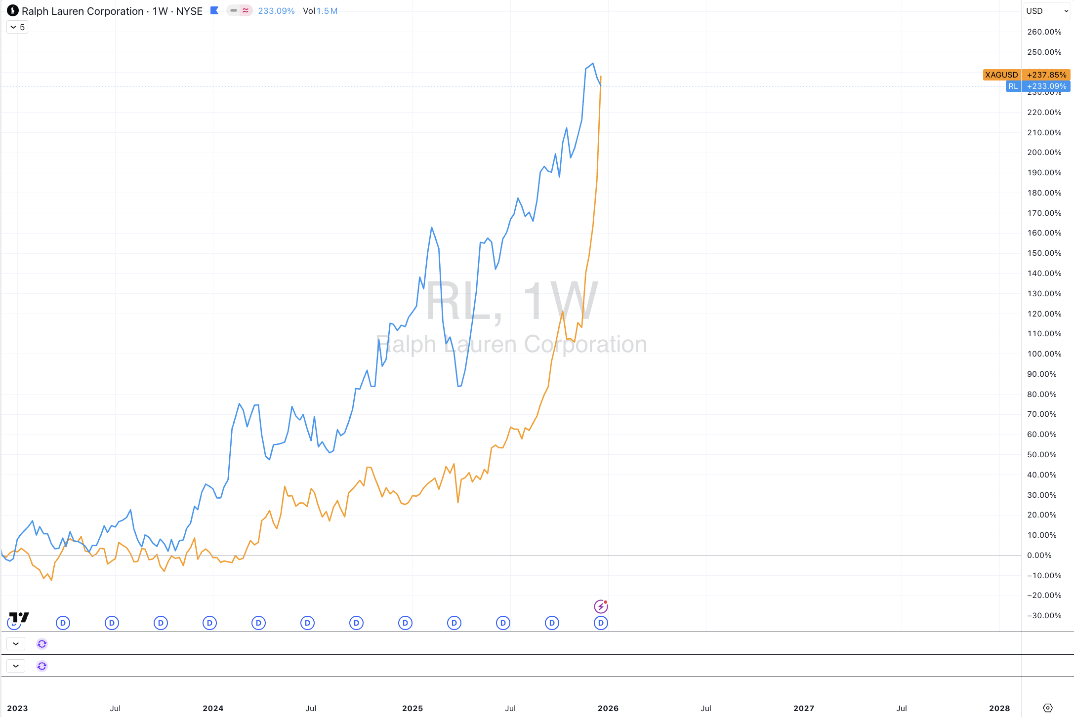 Over the 3 years, the share price of Ralph Lauren has outperformed the price of Silver.