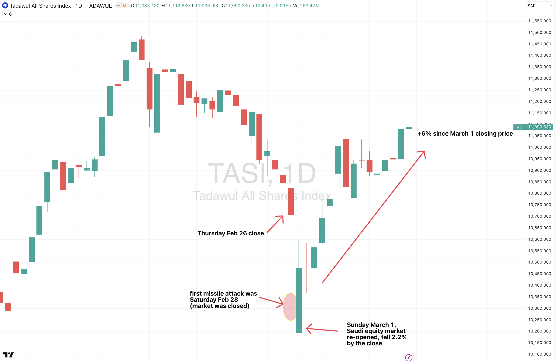 Saudi Arabian equities have risen 6% from its recent ebb.