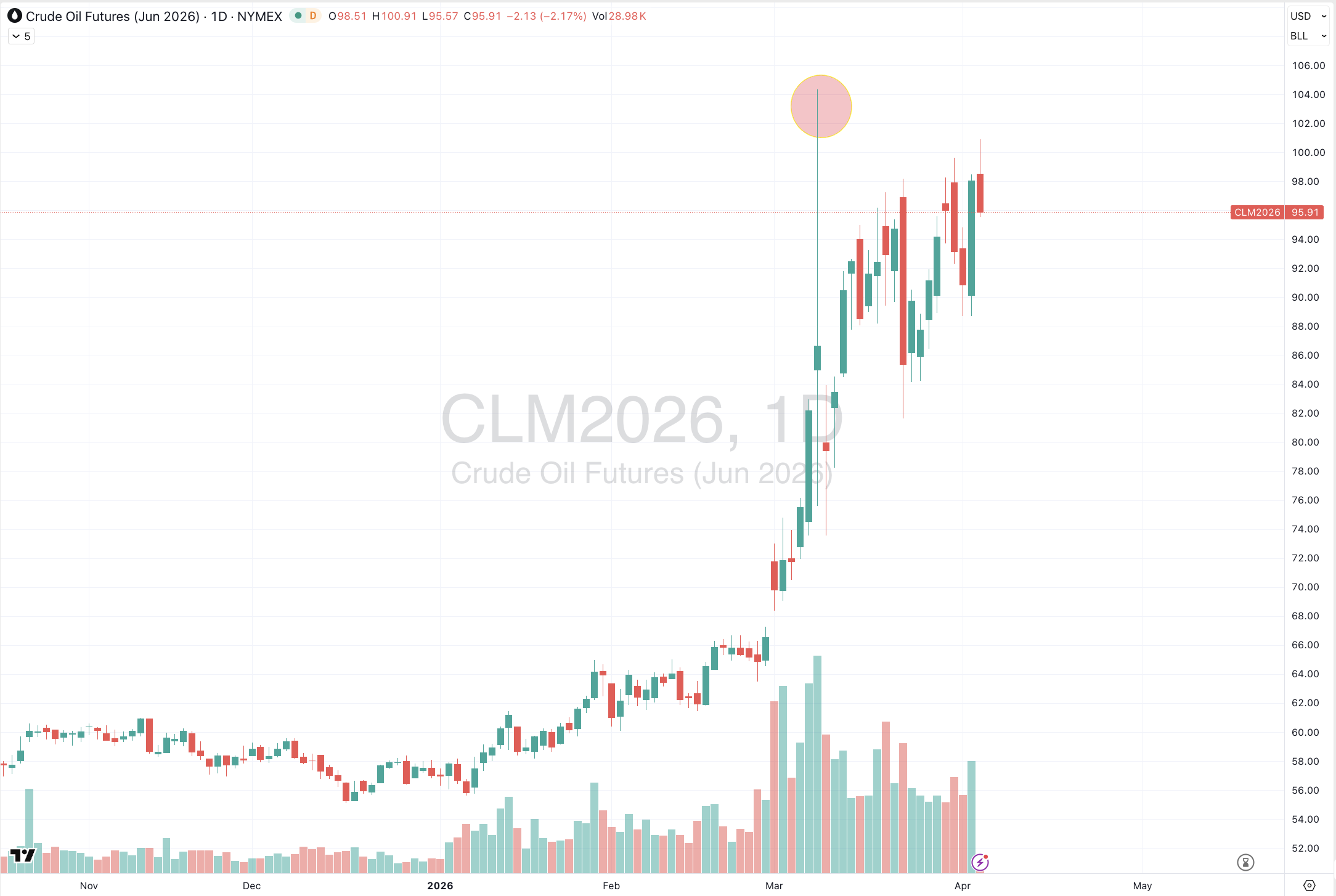 the June contract of WTI Crude Oil is not trading above the high seen 1 month ago, and it’s the same price as 3 weeks ago.