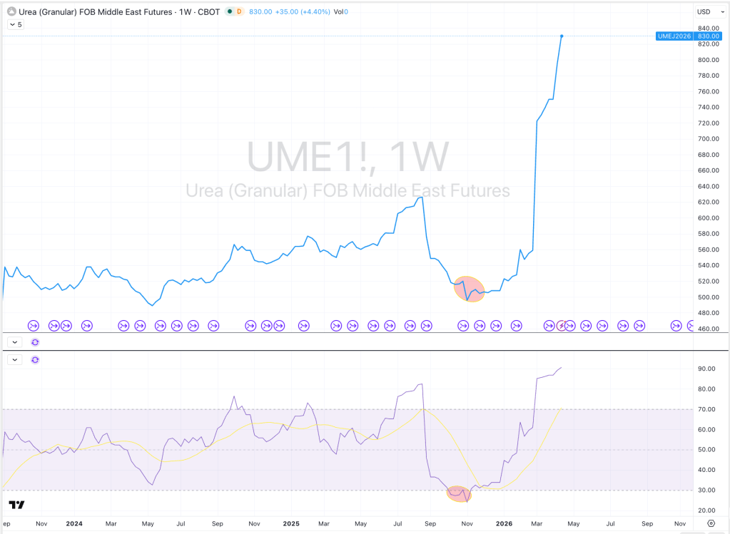 My October and early November 2025 weekly editions of Macro Extremes listed Middle Eastern Urea prices as registering oversold readings.