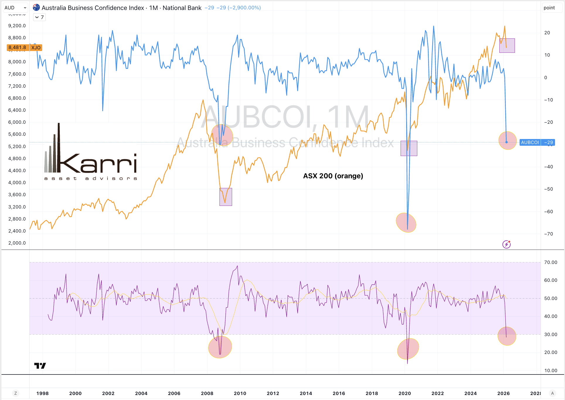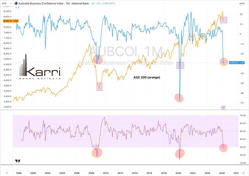 When the National Australia Banks’ Australian Consumer Confidence Index is so pessimistic (as denoted by the circles), then take a look at the rectangles placed on the ASX 200 Index.