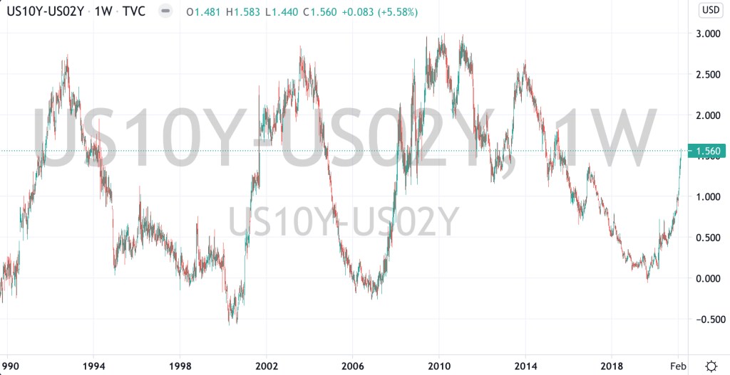 The latest chatter about the steepening of the yield curve between the yield of the US Government 10 year bond (minus) and the 2 year bond is no big deal.