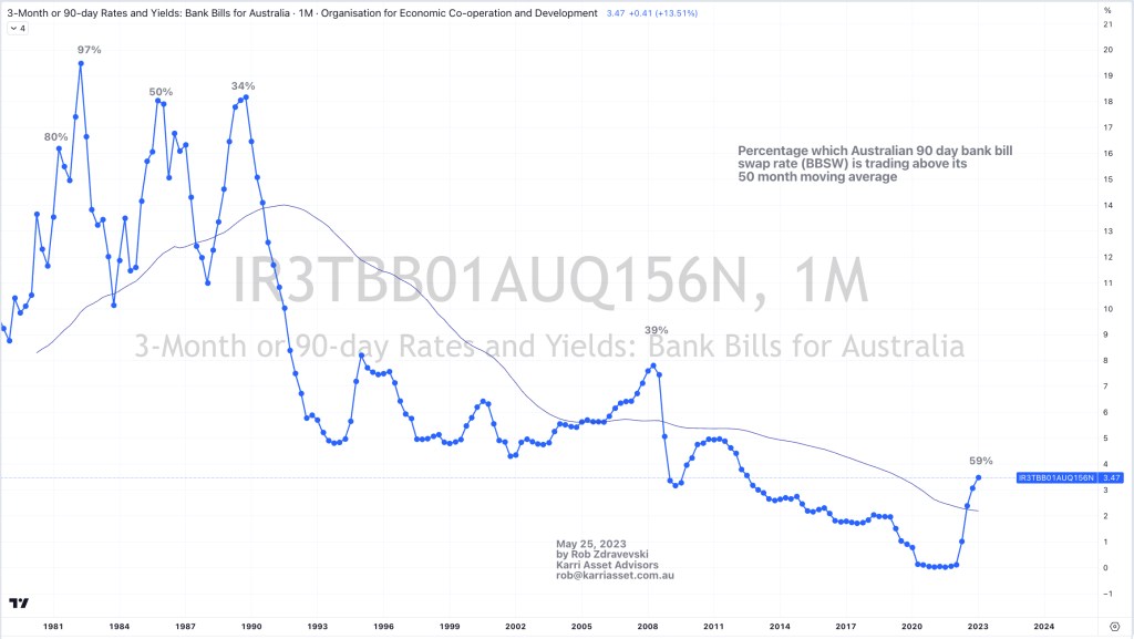 So, I’ll look for the Australian 2 year bond yields (currently 4.05%) to fall to the 3.60% – 3.35% range before rates embark on their next wave higher.