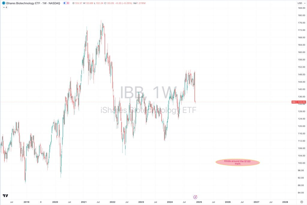 For some reference, while the iShares Biotech ETF #IBB will likely bounce in the near term, I’ll look for it to eventually trade down slightly below the $100 mark.