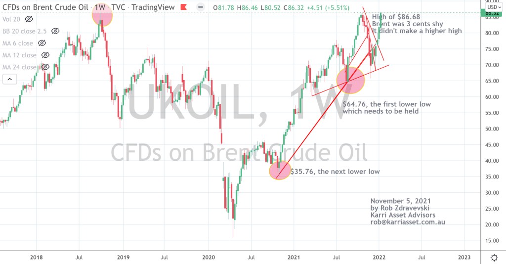 Whilst the chart below is current, it has notes on it from a post on November 5th, 2021, which also shows the previous high in Brent at $86.71 from October 3, 2018.