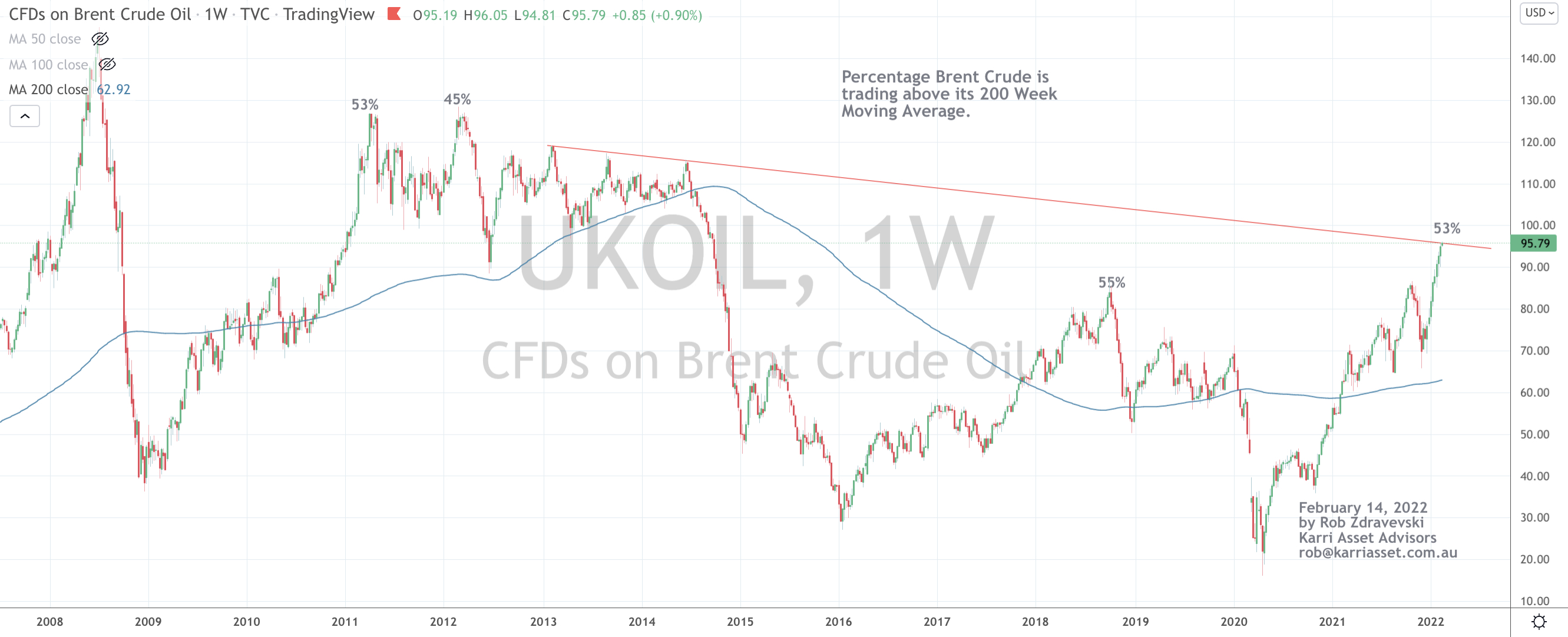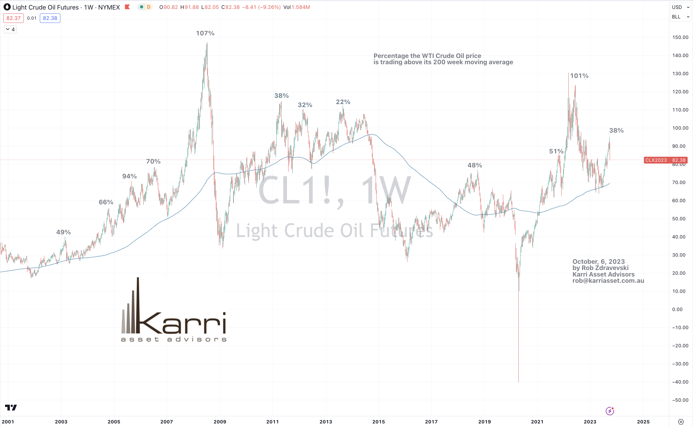 The study below shows the percentage that the WTI Crude Oil price was trading above its 200 week moving average.