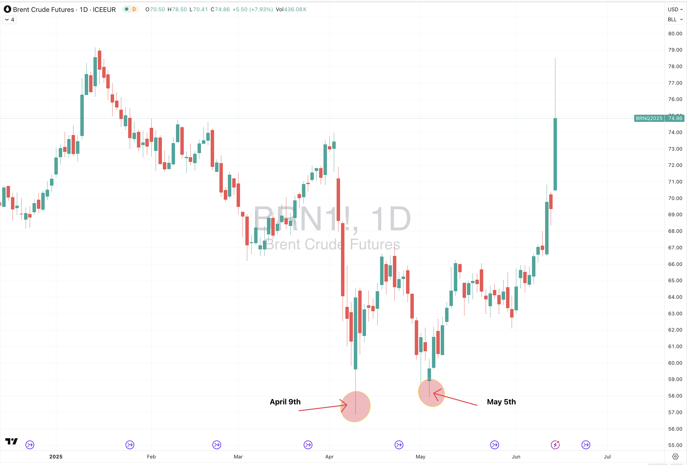 West Texas Intermediate and Brent Crude touched below $55 and $58 respectively, on 2 occasions in April and May 2025.