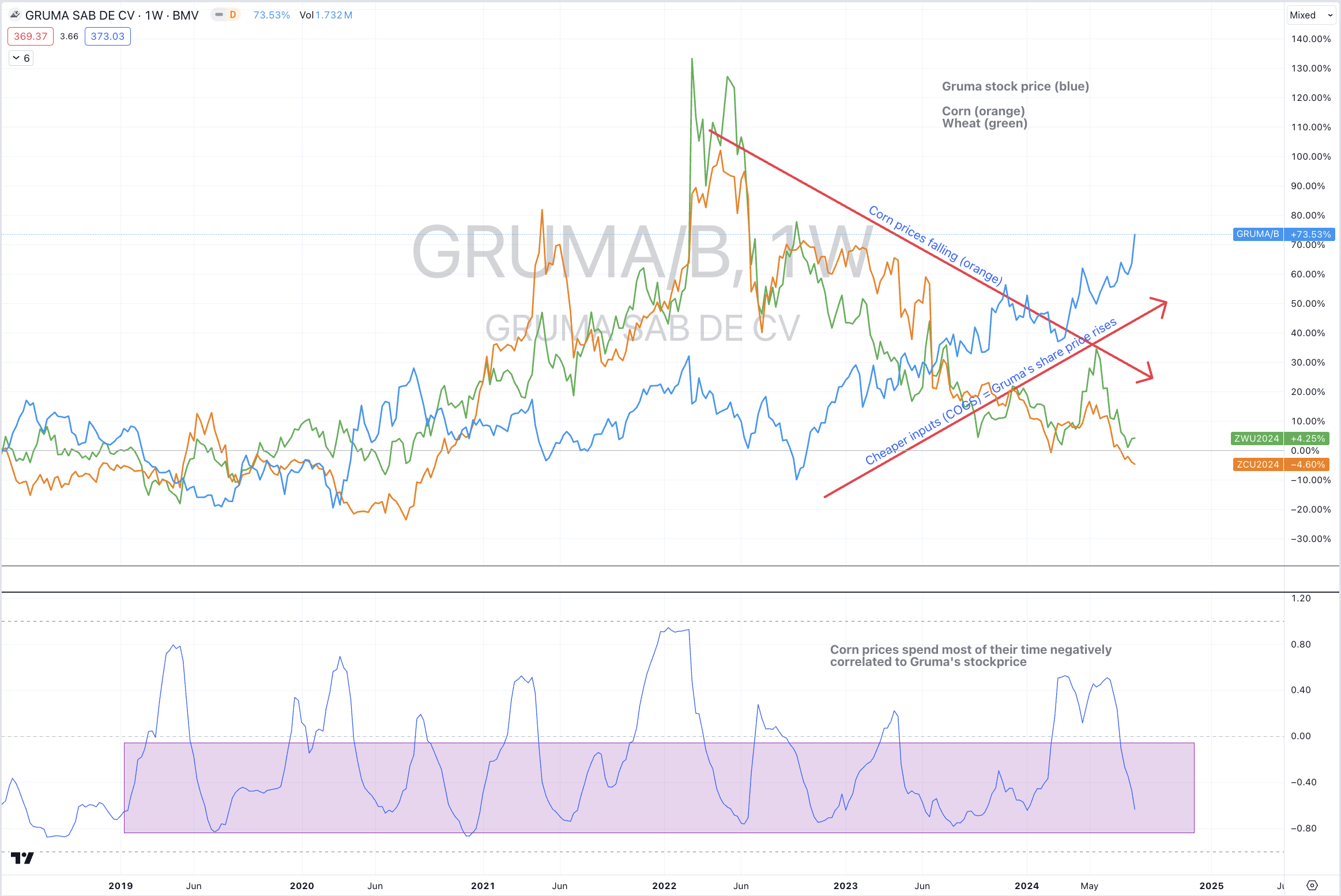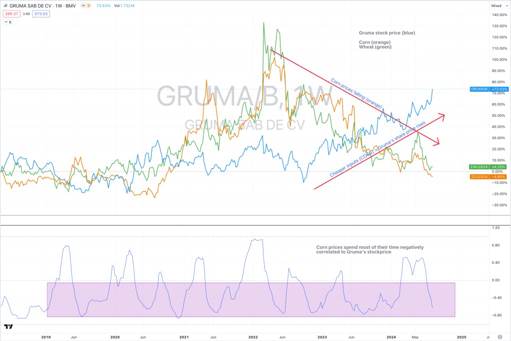 The decline in price over the past 12 months has helped the share prices of companies such as Gruma (Mexican tortilla maker), Pepsi and Kellogg, while share prices of other beverage companies, namely Coca Cola have lagged their peers and index considerably.