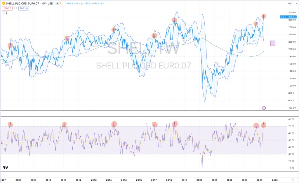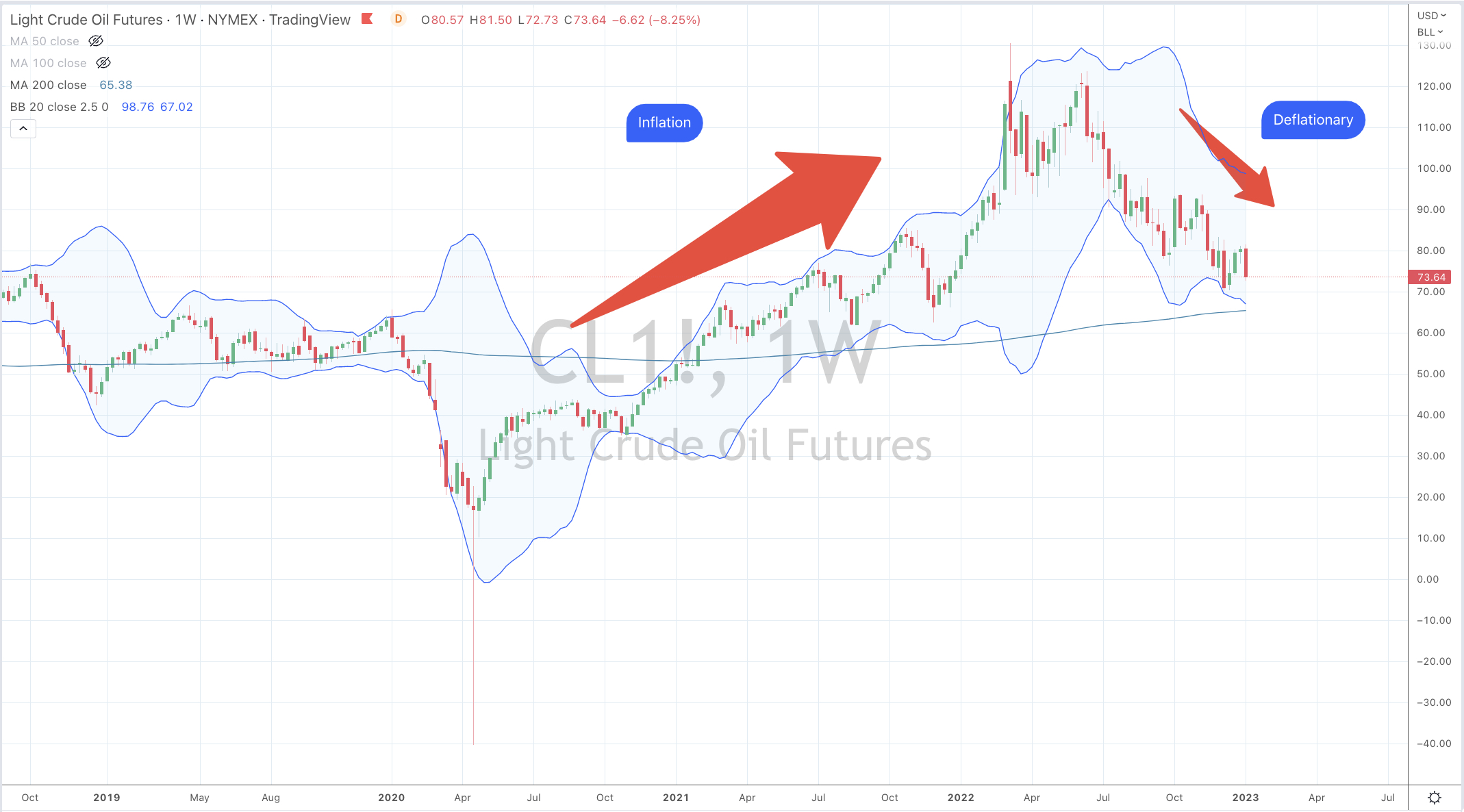 The study below shows the percentage that the WTI Crude Oil price was trading above its 200 week moving average.