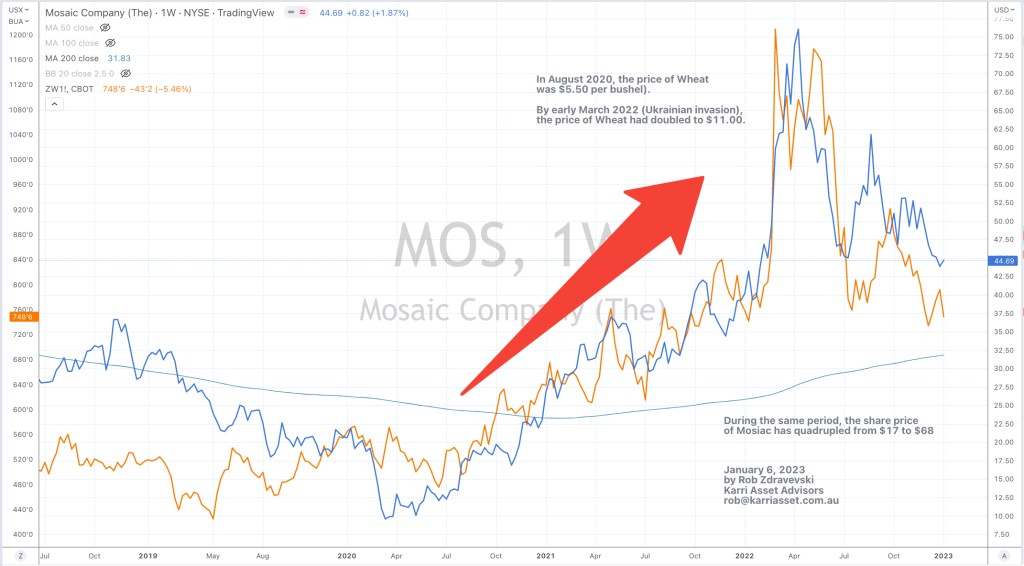 Now, the price of Wheat and Mosiac Company (one of the world’s largest fertiliser companies) are both trading below pre-Ukraine invasion levels.