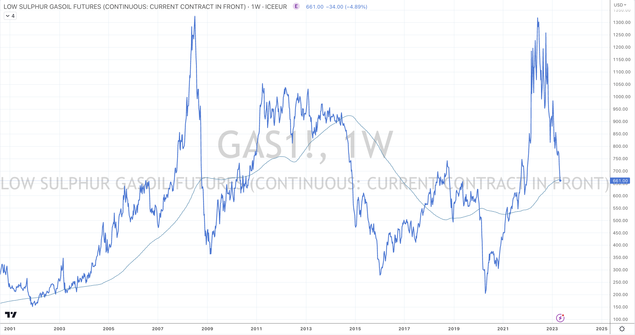 Today, Gasoil (diesel) and Heating Oil completed their mean reversion back to their 200 week moving average. This was prompted in this weekends edition of Macro Extremes.