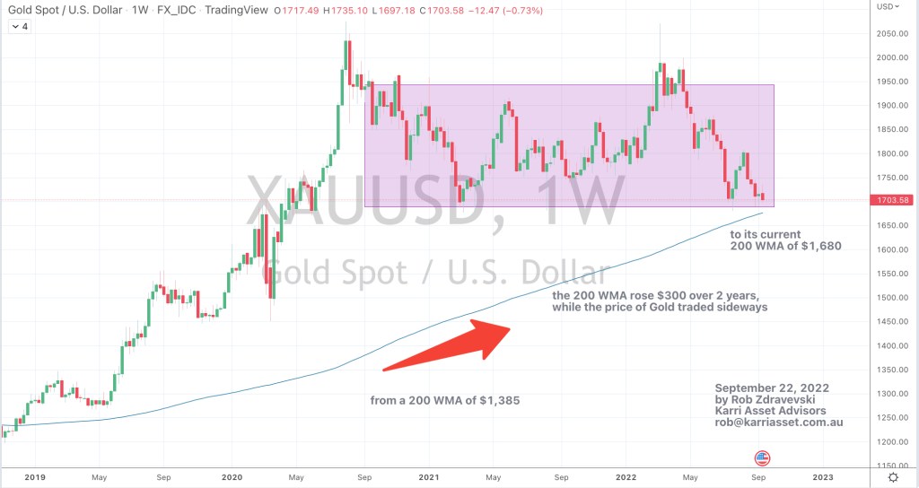 The chart and graphics below show the Gold price (in USD) trading sideways for 2 years while the 200 week moving average has risen $300 or improved by more than 20%.