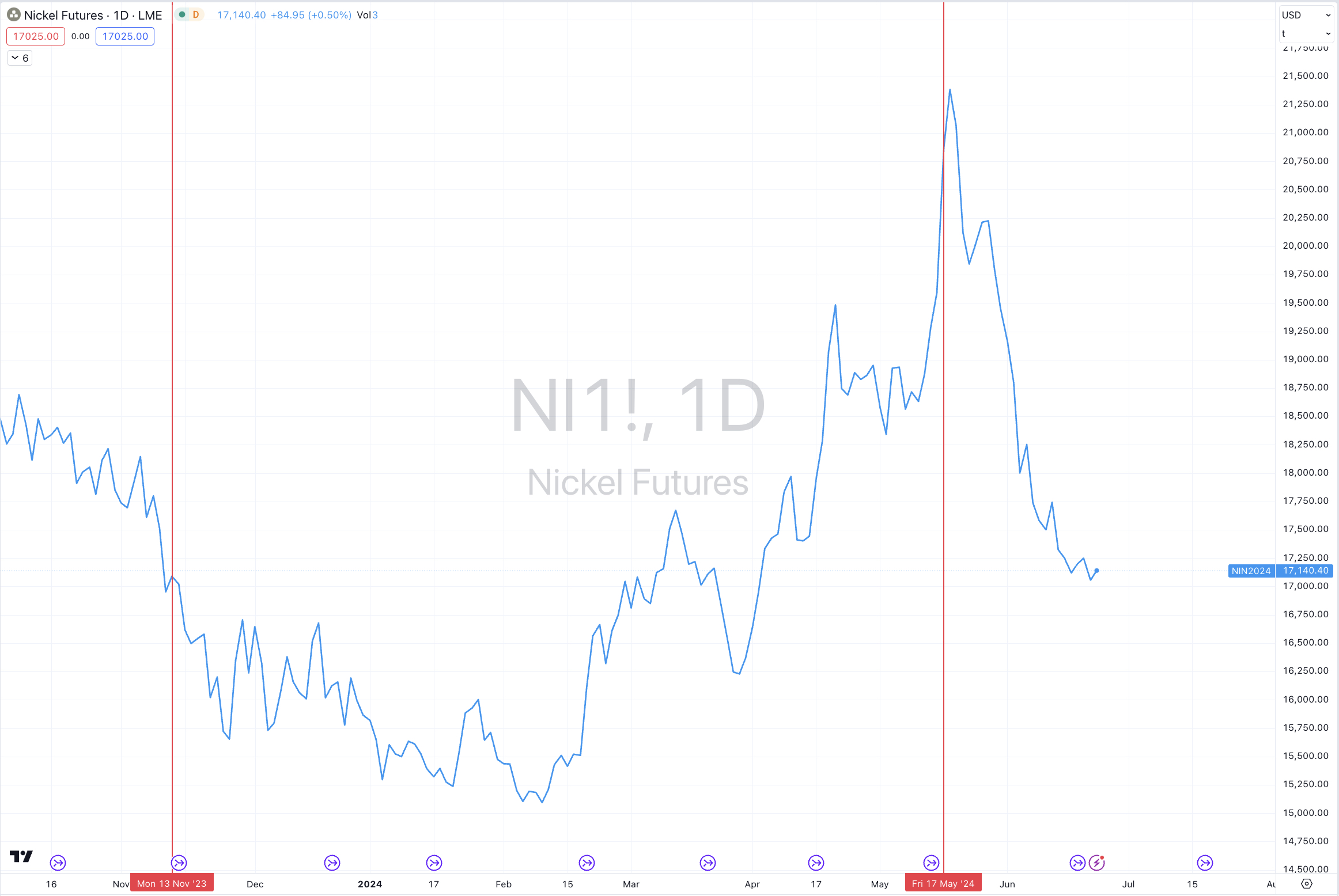 Today, one month since that peak, the price of Nickel has declined 20% and is now trading at $17,140.
