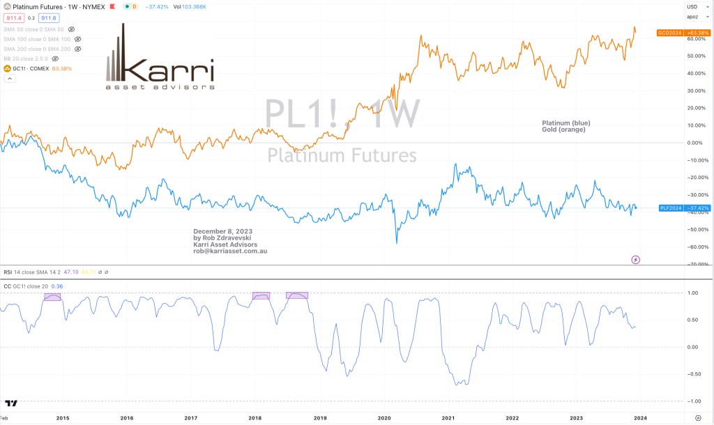 The chart below shows Platinum and Gold plotted over each other while the lower study is the correlation coefficient.