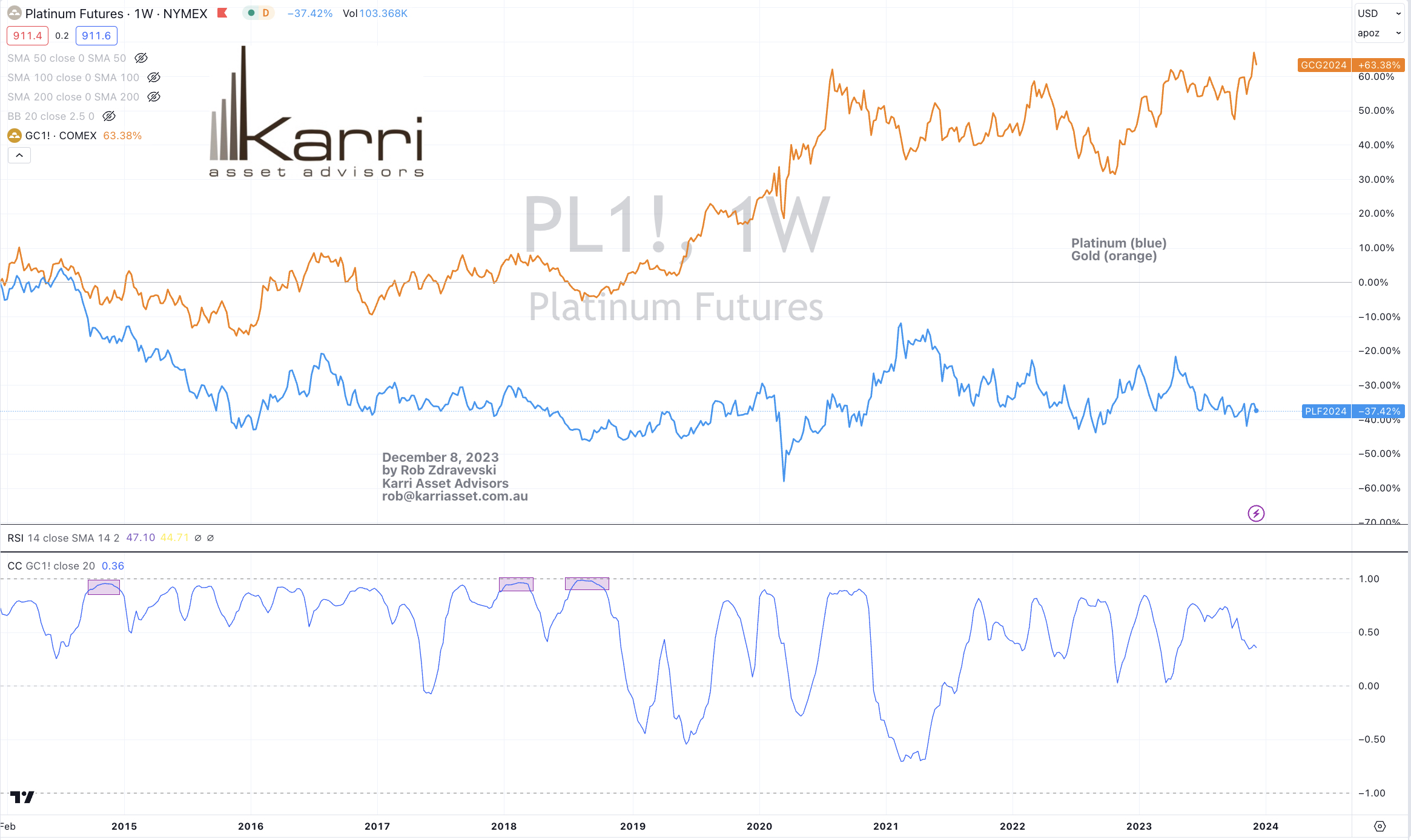 The chart below shows Platinum and Gold plotted over each other while the lower study is the correlation coefficient.