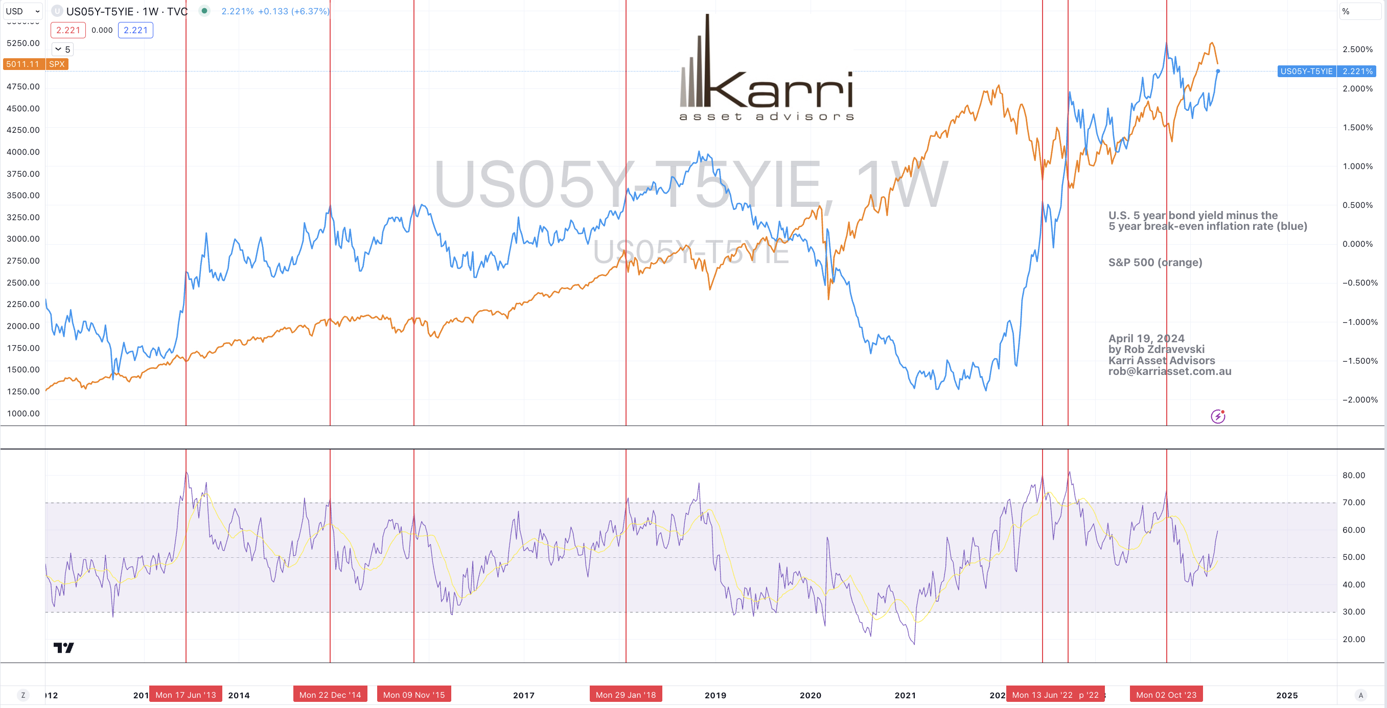 My study of the U.S. 5 year government bond yields minus the 5 year breakeven inflation rate is close to hitting a combination of metrics which increases probability that the S&P 500 commences a new or extends an existing rally.