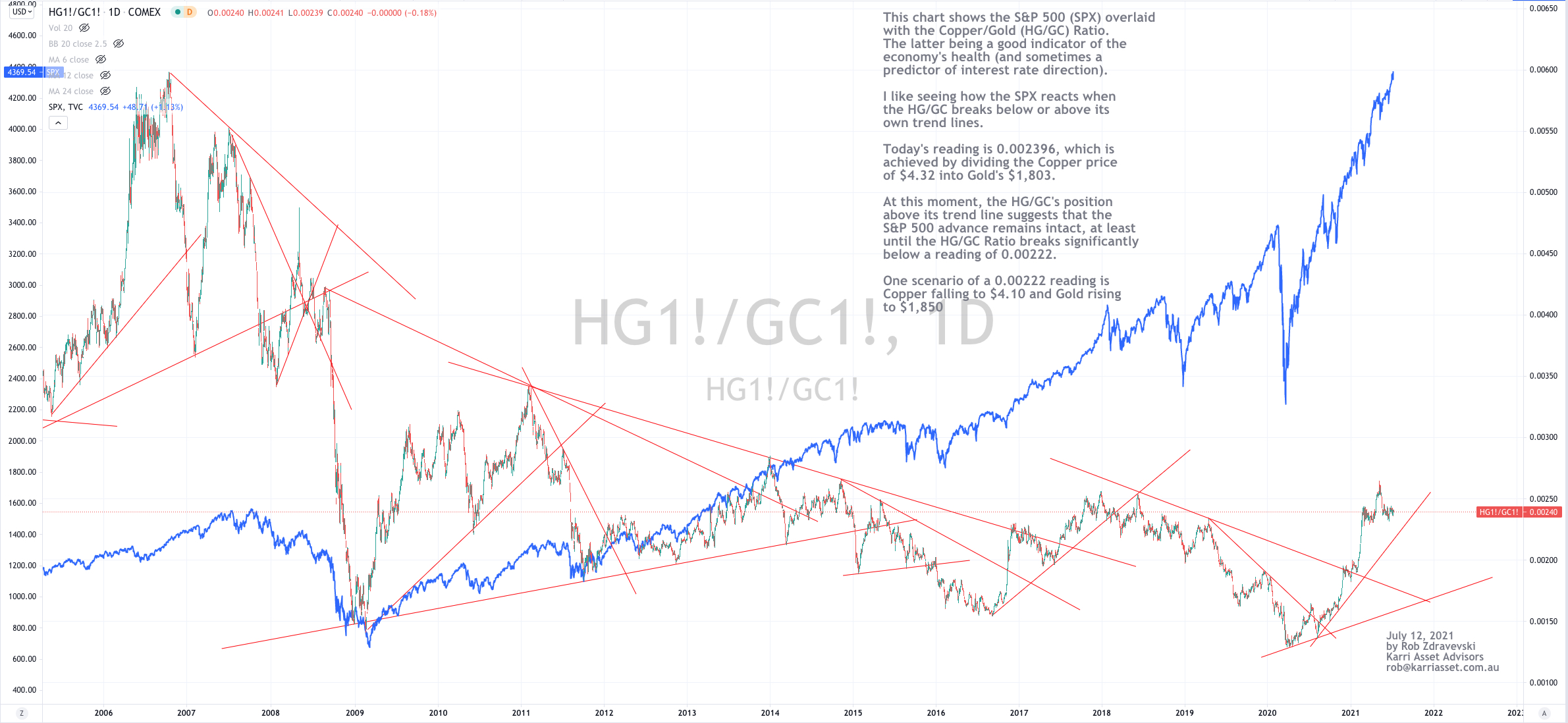 The chart below shows the S&P 500 (SPX) overlaid with the Copper/Gold (HG/GC) Ratio on a daily basis over the past 15 years.