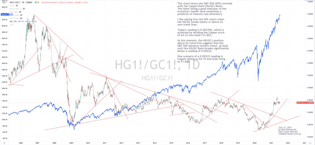 At this moment, while the HG/GC’s is trading above its trend line (and a reading of 0.00222) it is suggesting that the S&P 500 advance remains intact……..